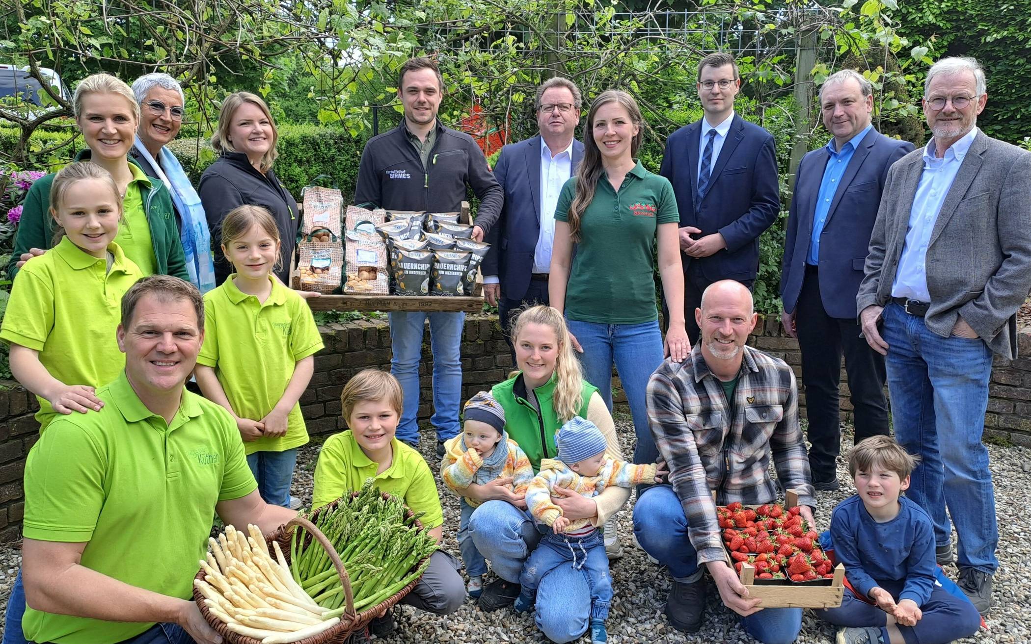 Familie Goetzens, Escheln 41b, informiert über den Spargelanbau, Erdbeeren aus dem Treibhaus, das automatische Melksystem und das Hühnerhotel. Kulinarisch gibt es Molkereiprodukte, Säfte, edle Brände, Fleisch vom Limousin-Rind und Brot, Frisches aus der Bratpfanne, Spargelsuppe und Erdbeer-Köstlichkeiten. Die Ausstellung mit Landmaschinen und Oldtimern wird auch Kindern gefallen. Für sie gibt es auch eine Stroh- und eine Hüpfburg, Kinderschminken, einen Maltisch und Wasserspaß mit der Feuerwehr.