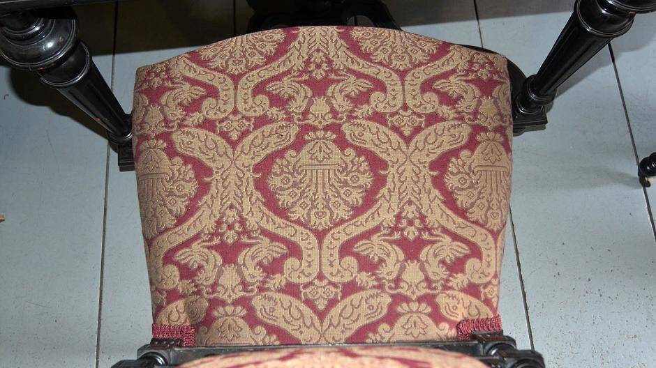 Vor der restaurierten Sitzgruppe v.l.: Heide Gerritzen, Vorsitzende des Vereins Freund der Museen Burg Linn, Dr. Christoph Dautermann, stellvertretender Leiter des Museums Burg Linn, Gisbert Rentmeister, Manufaktur Rentmeister Krefeld sowie Gerd Brunner, Raumausstatter mit dem Schwerpunkt Möbelrestauration und -bau.