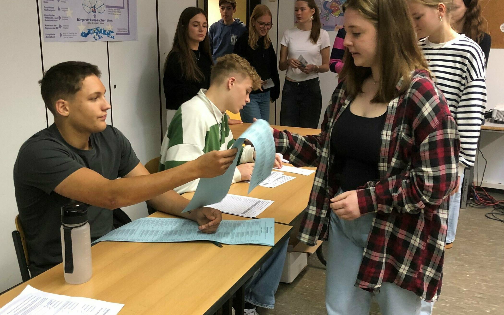Bei der Juniorwahl 2024, die in dieser Woche am Städtischen Meerbusch-Gymnasium durchgeführt wurde, handelt es sich um eine realitätsnahe Simulation der Europawahl, die dieser Tage auf dem Kontinent und heute auch in ganz Deutschland läuft. Wie beim Vorbild haben die Schülerinnen und Schüler, die vorher extra in ein Wahlregister eingetragen worden waren, Wahlbenachrichtigungen erhalten, in denen ihnen der Termin der Wahl mitgeteilt wurde. Am Donnerstag, dem Tag der Abstimmung, drängten sich die jungen Leute förmlich vor dem Raum 133 im SMG, um ihre „Bürgerpflicht“ wahrzunehmen. Jede Klasse hatte dabei ihren eigenen Timeslot. Von den Wahlhelfern erhielten die Schülerinnen und Schüler die Stimmzettel, mit denen sie sich dann – jede und jeder für sich – in die Wahlkabine zurückziehen und ihr Kreuzchen machen konnten. Anschließend landeten die Wahlzettel in der Urne.