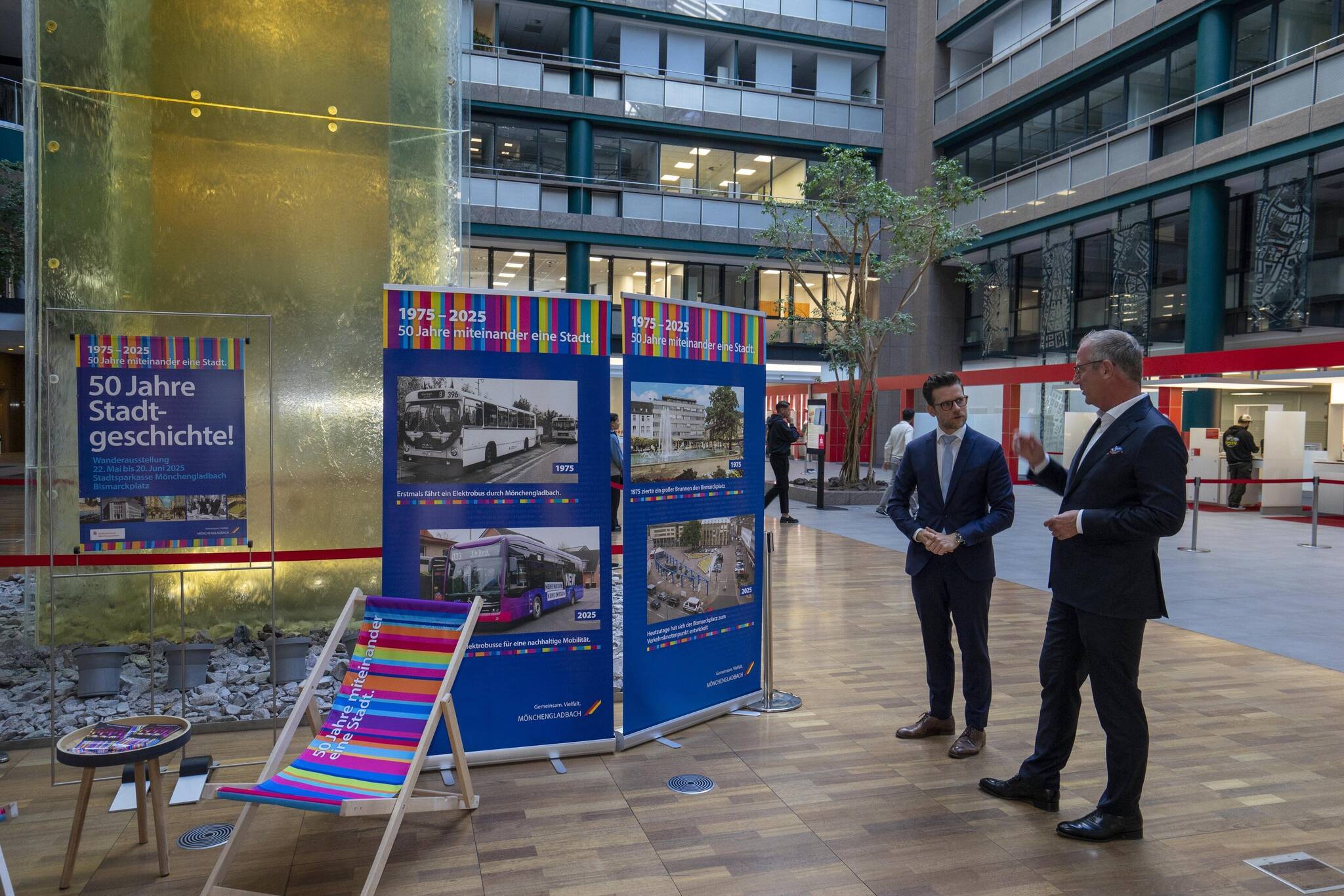 „Die Vielfalt und den Zusammenhalt in unserer Stadt zu feiern und Stadtgeschichte erlebbar zu machen, das haben wir uns für das Jubiläumsjahr vorgenommen“, so Oberbürgermeister Felix Heinrichs. „Die Wanderausstellung, die auch an Stationen in Rheydt und Wickrath zu sehen sein wird, ist dafür ein gelungenes Beispiel.“ Stadtsparkassen-Vorstand Ralf Grewe erklärte: „Ich freue mich sehr, dass die Kundenhalle unserer Sparkassenhauptstelle die erste Station der Ausstellung ist, die nun für ein halbes Jahr durch Mönchengladbach auf Tour gehen wird. Dargestellt sind eindrucksvolle Beispiele, wie sich unsere Stadt in den letzten 50 Jahren entwickelt hat.“