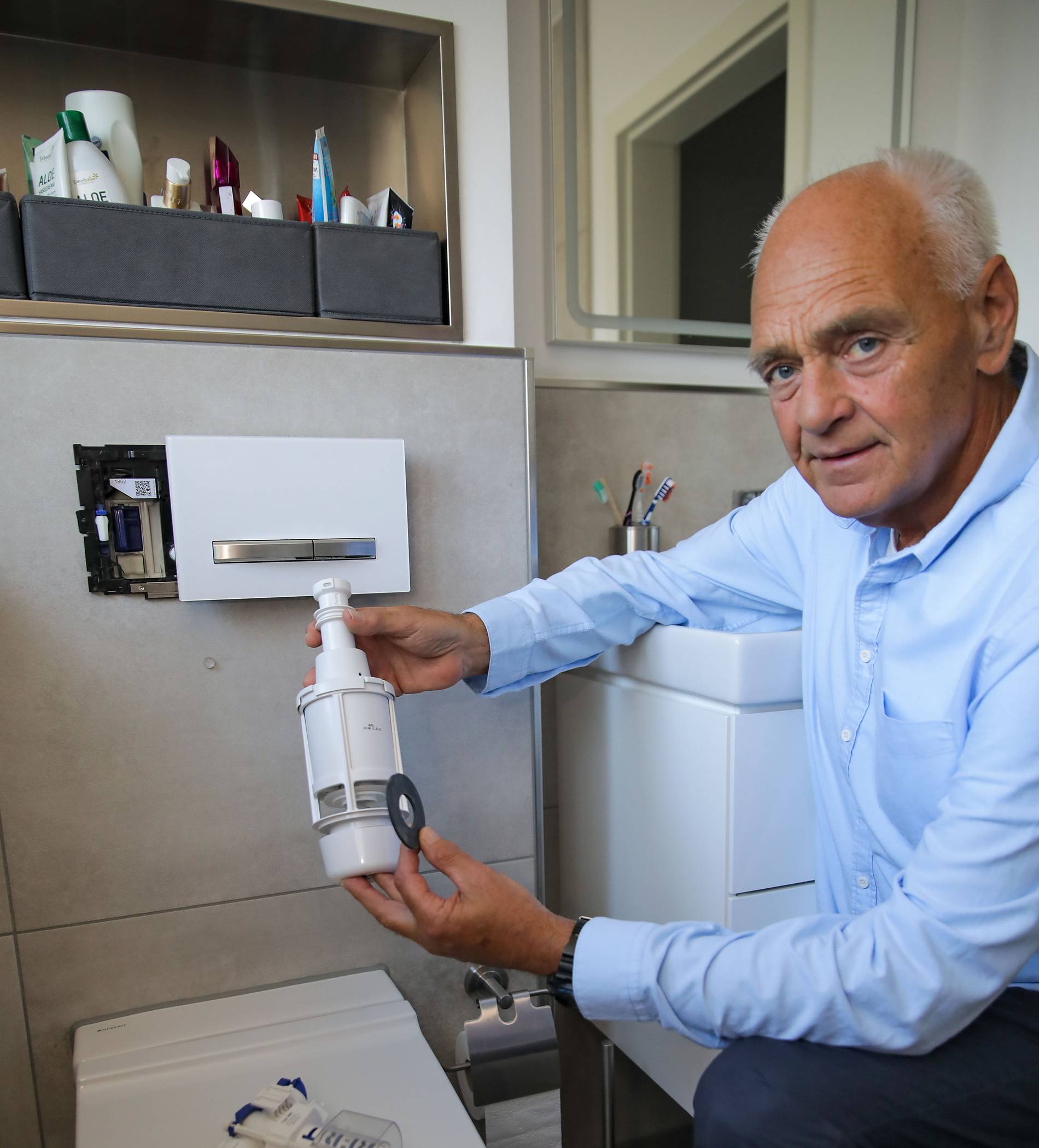 Auch nicht teuer: Wenn der Spülkasten nicht mehr richtig arbeitet, weil er verschmutzt oder verkalkt ist, dann hilft bereits der Einsatz eines Reinigungsmittels. Es könnte aber auch das Zulaufventil, das den Wassernachlauf regelt, defekt sein, und immer weiter Wasser in den Kasten nachlaufen lassen, der das dann durch ein Ablaufrohr in die Toilette spült. Vor allem bei sehr alten Toiletten kann auch der Schwimmer verklemmt sein und nicht mehr den Wasserstand anzeigen. Auch dann steigt das Wasser ständig nach. Alles Defekte, deren Behebung nicht viel kostet. „Einfach ab und an den Klokasten auf machen und nachsehen, ob noch alles in Ordnung ist“, rät Detlef Poullie, das gehe auch bei Modellen, die in die Wand eingelassen sind. „Viele wissen gar nicht, dass man die Wassermenge pro Spülung an der Heberglocke ganz einfach selbst einstellen kann“, sagt Detlef Poullie.
