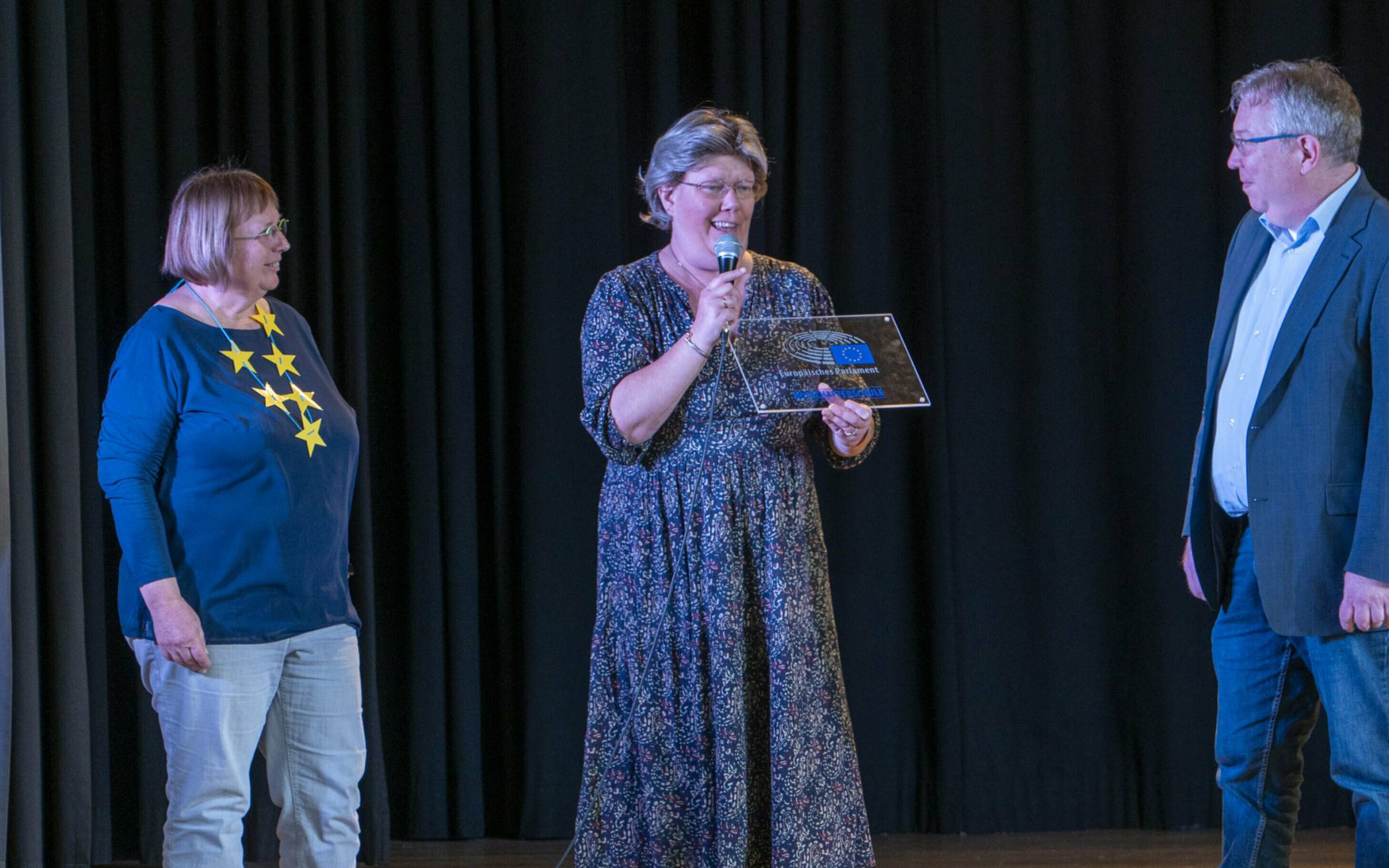 Neben der Übergabe gab es auch eine von Schülerinnen der Europagruppe geleitete Diskussionsrunde, an der neben Kammerevert auch Schulleiter Markus Heynckes, Fachbereichsleiter Schule und Sport Dr. Sascha Derichs und Bürgermeisterin Josephine Gauselmann teilnahmen. Thematisch ging es dabei unter anderem um Fragen zur Bildungsgleichheit in Europa, der Möglichkeit nach mehr politischer Bildung und verstärkter Demokratiearbeit an Schulen. Zuvor hatte die betreuende Lehrerin der Europa-Gruppe der Gesamtschule Volksgarten, Susanne Gründler, beschrieben, welche Beweggründe es für dieses Projekt gegeben habe: „Der Austausch im Rahmen des Erasmusprojektes und die damit verbundenen interkulturellen Freundschaften sind einfach wichtig, um gemeinsam über die Grenzen hinaus für gewisse Werte einzustehen. Der Zusammenhalt in Europa und die Demokratiebildung sind in der heutigen Zeit nochmal wichtiger geworden“, betonte Gründler, was von Schulleiter Markus Heynckes zustimmend aufgegriffen wurde: „Die Demokratiebildung ist neben der normalen Schulbildung ein elementarer Grundstein und wir wollen diesen Auftrag wahrnehmen, um Demokratie und Frieden in Europa zu fördern.“