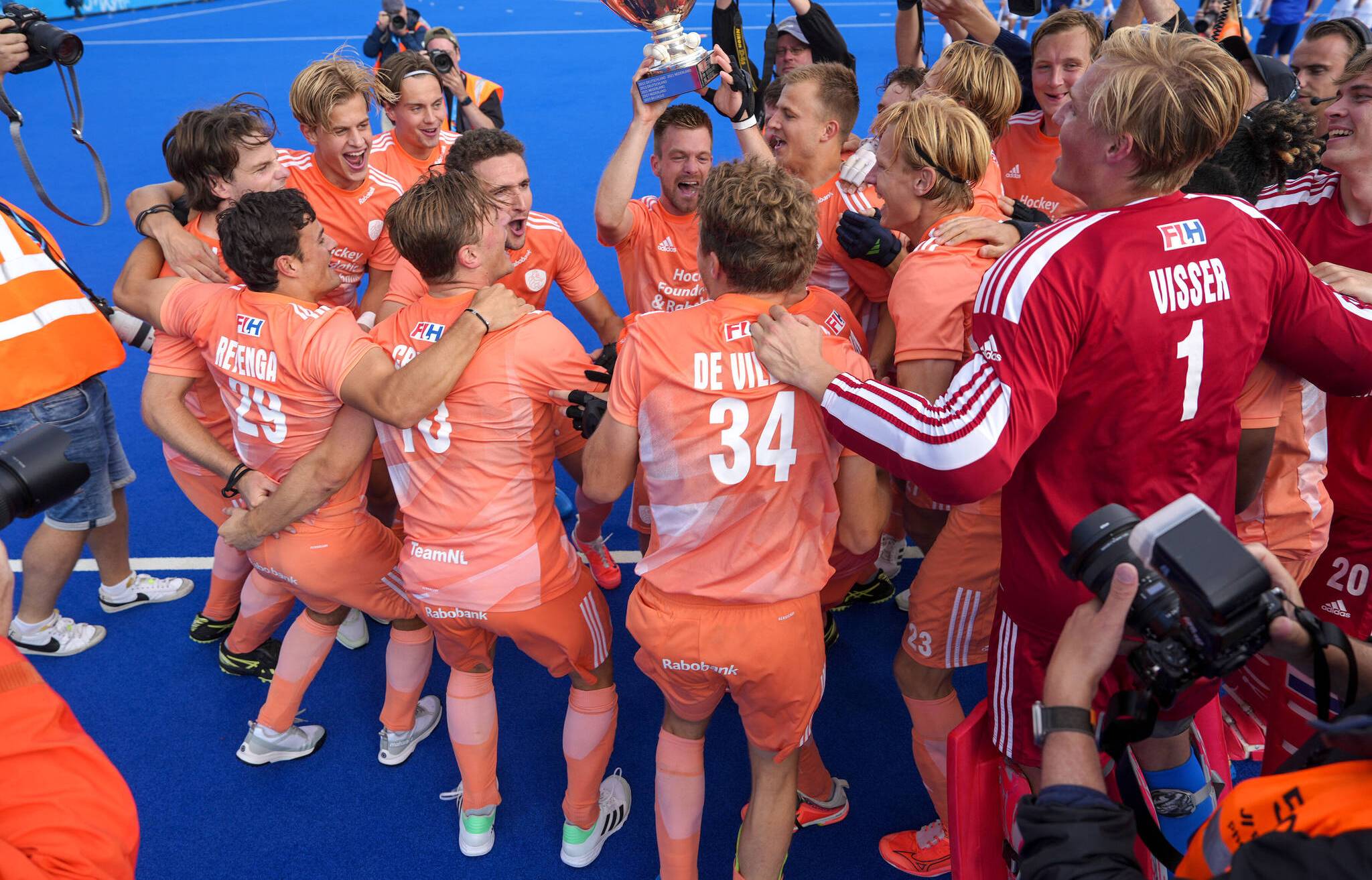 Doppel-Europameister! Nach dem Sieg der Damen machen auch die Herren der Niederlande den Europameistertitel perfekt. In einem hart umkämpften Spiel mit zwei gehaltenen 7-Metern von Visser triumphiert die Mannschaft in Orange.