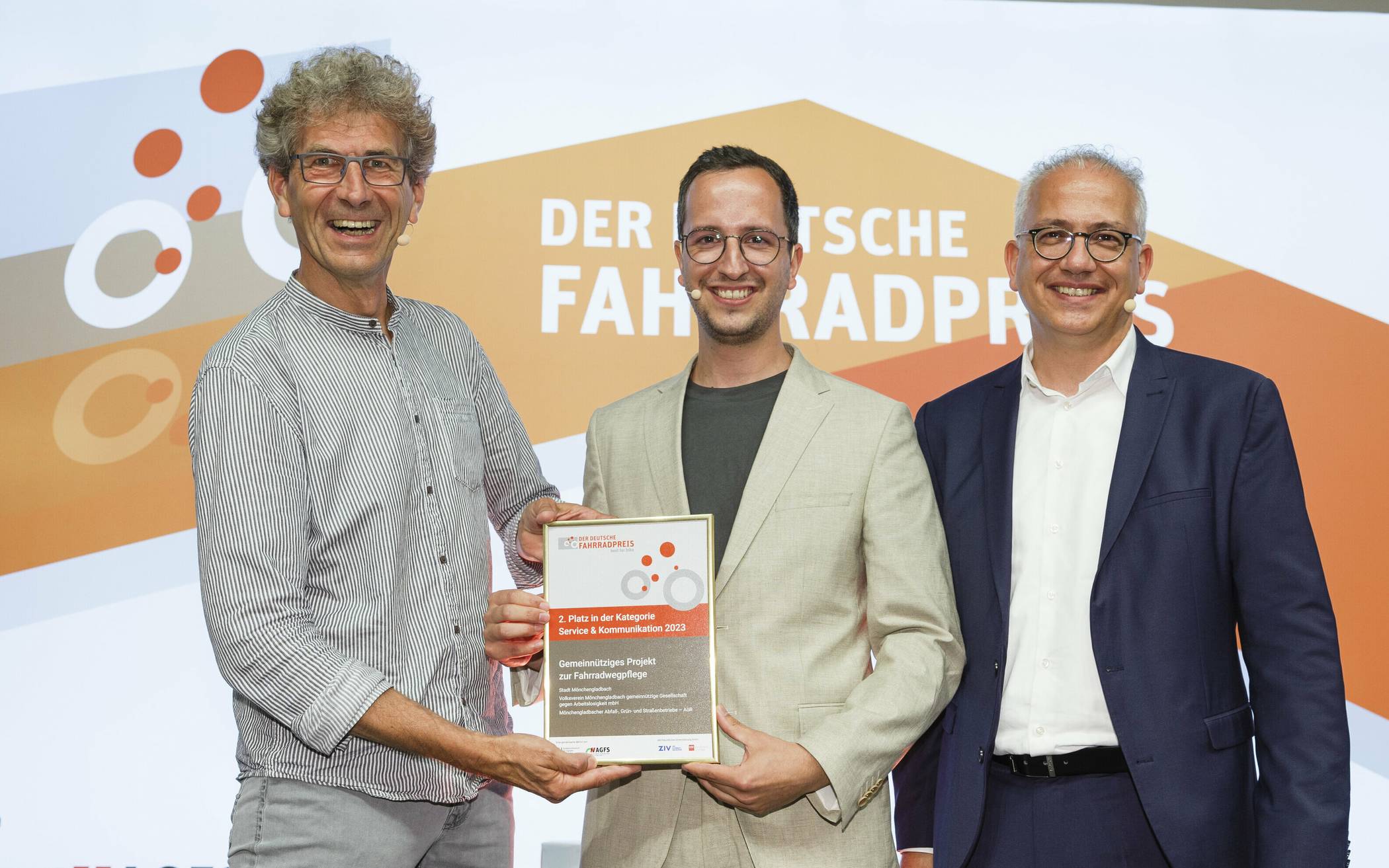 Gewinner der Kategorie Service und Kommunikation war das „KVB-Lastenrad“. Die Kölner Verkehrs-Betriebe integrieren Elektro-Lastenräder in den öffentlichen Nahverkehr. Dritter wurde das Hamburger Projekt „PrioBike“. Entlang dreier Velorouten in Hamburg haben Radfahrende bei 18 km/h eine grüne Welle.