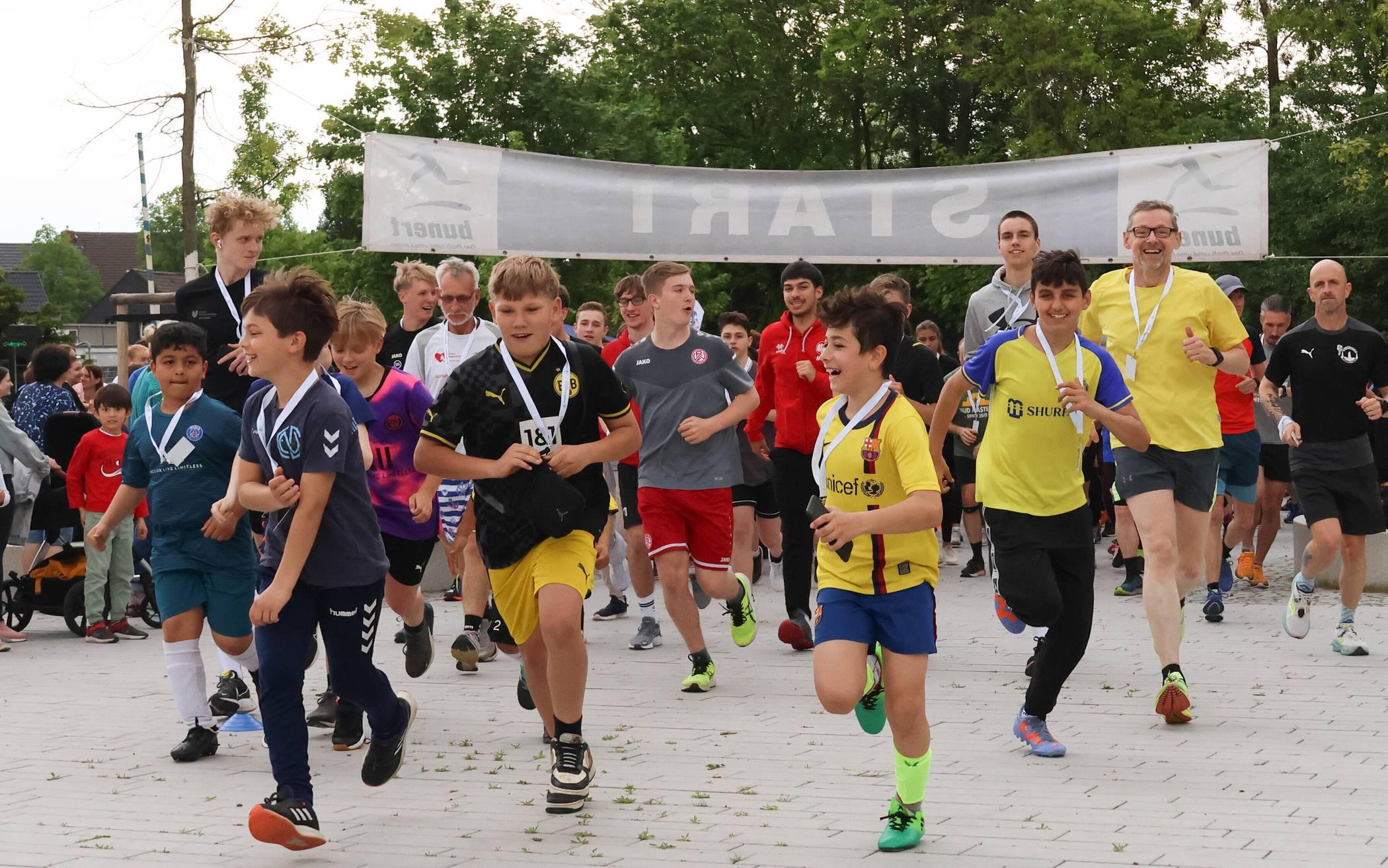 Wie immer war die Stimmung ganz hervorragend: Ganze Laufgruppen und Lauftreffs, Sportvereine, Klinikmitarbeiter, Schüler und auch jede Menge Spontanentschiedene waren mit Freude und Begeisterung dabei. Einmal mehr erwies sich die Sportanlage des TV Asberg als idealer Veranstaltungsort, mit einem abwechslungsreichen Kurs und genug Platz für Helfer und Rahmenprogramm. Das bewährte Helferteam strich die Laufkarten in jeder Runde ab, verteilte Wasserbecher und Bananen.